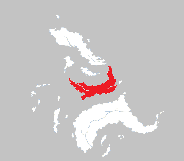 In het rood de ligging van het eiland Omburu.